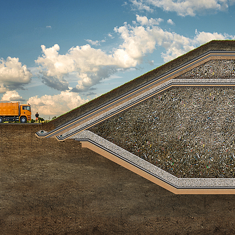Compara-se o transporte de materiais para a vedação de um aterro fictício. O projeto de construção é considerado uma vez com uma vedação feita com mantas geotêxteis bentoníticas e outra vez com uma vedação feita com argila. Assume-se uma área de aterro de 4.500 m².